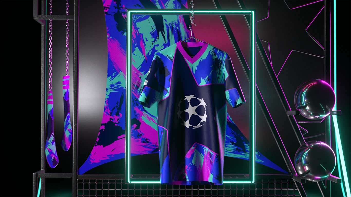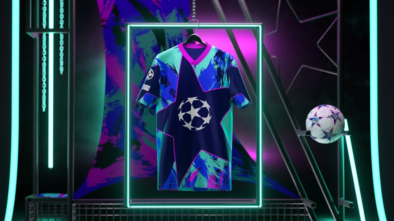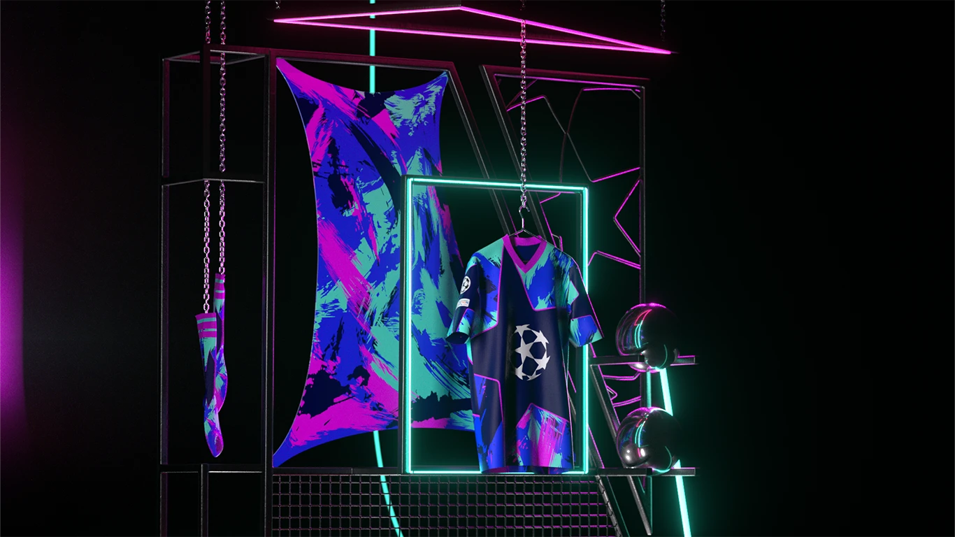 The brief was to bring the kit design to life by translating its visual language into a fully realised 3D experience. This included designing an environment that reflected the energy, prestige, and atmosphere of the UEFA Champions League, while showcasing the kit as the hero asset. The final execution needed to feel premium, bold, and unmistakably Champions League.